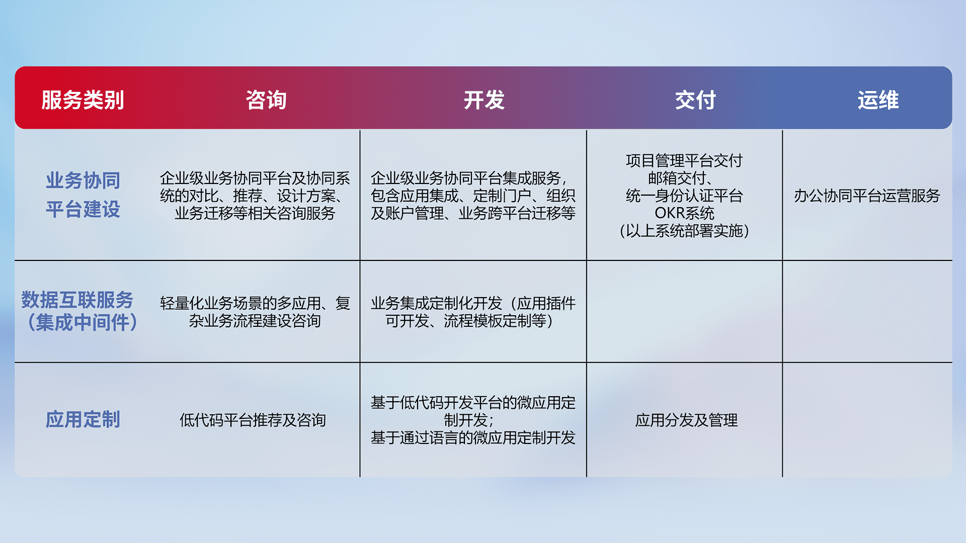 针对钉钉、、、、企微、、、、IDaas等平台级产品提供产品的规划、、方案、、交付、、、定制化开发等服务,,,,实现如统一协同办公、、、、智能客户服务、、、、混合会议管理、、智能数据查询、、、等业务场景,,实现数字化转型。。。